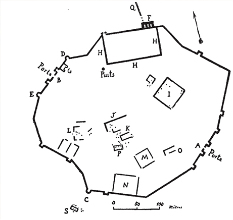 Baghai était en forme de trapèze assez peu régulier de 308 m de largeur sur 330 m de longueur[35]. Le site fut prospecté par Ch. Dhiel en 1883, ce qui lui permit de dessiner le plan de la cité (ph.l). Il décrit les contours de la ville ainsi : « l’enceinte de Baghai, assise sur un mamelon aplati qui domine la plaine, longeant soigneusement la crête de l’escarpement, de manière à assurer à la ville la protection du profond ravin qui la borde au nord-ouest »[36].